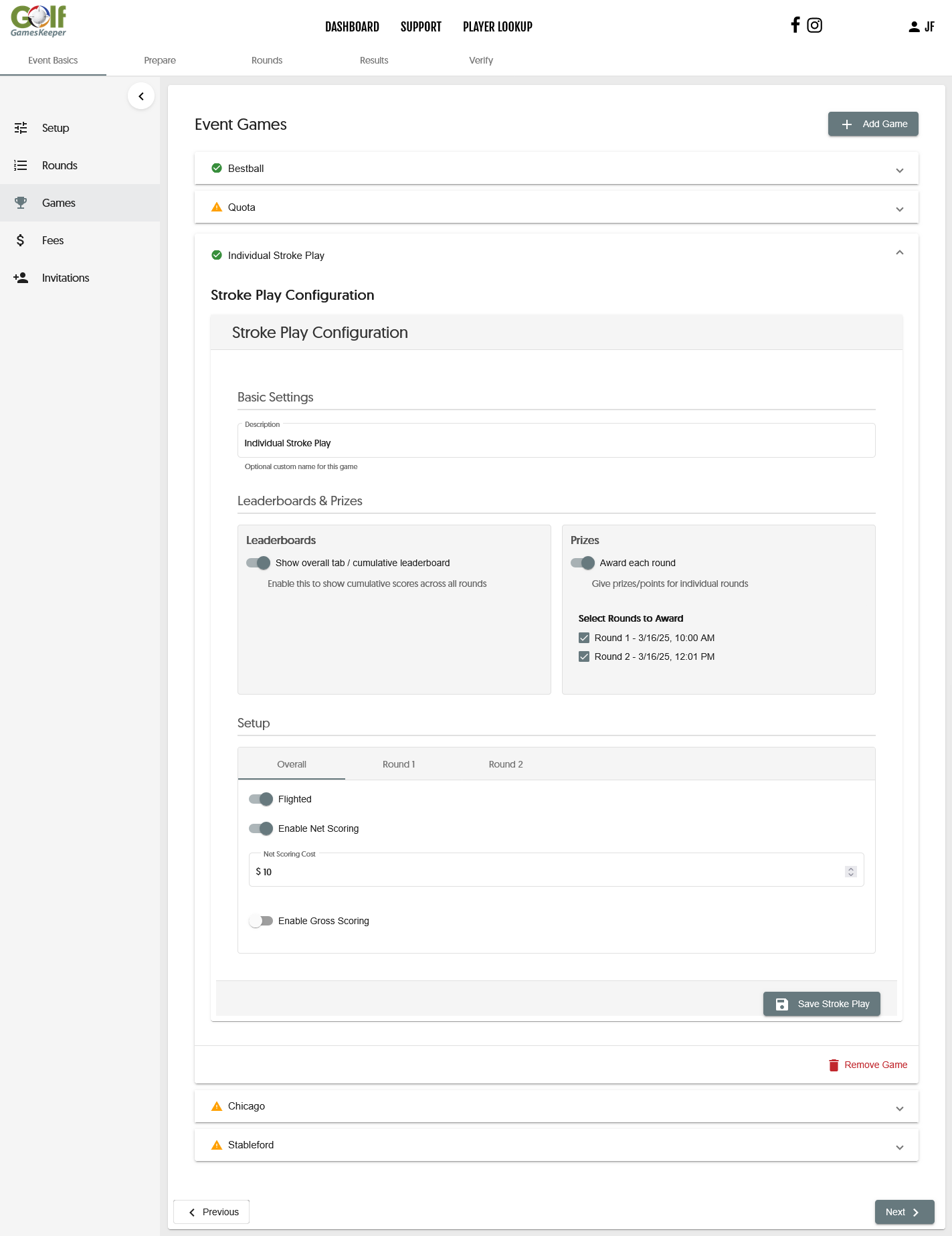 - Gross & Net Stroke Play